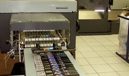 Alceadeira ST 100. Máquina para produção automatizada de revistas e catálogos com alceamento, grampeamento e guilhotina trilateral em linha.